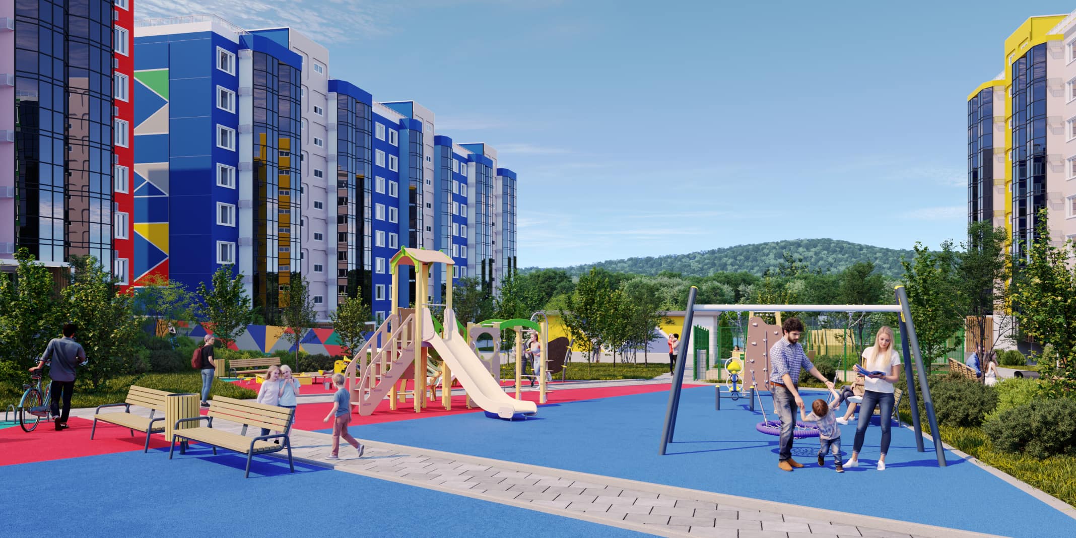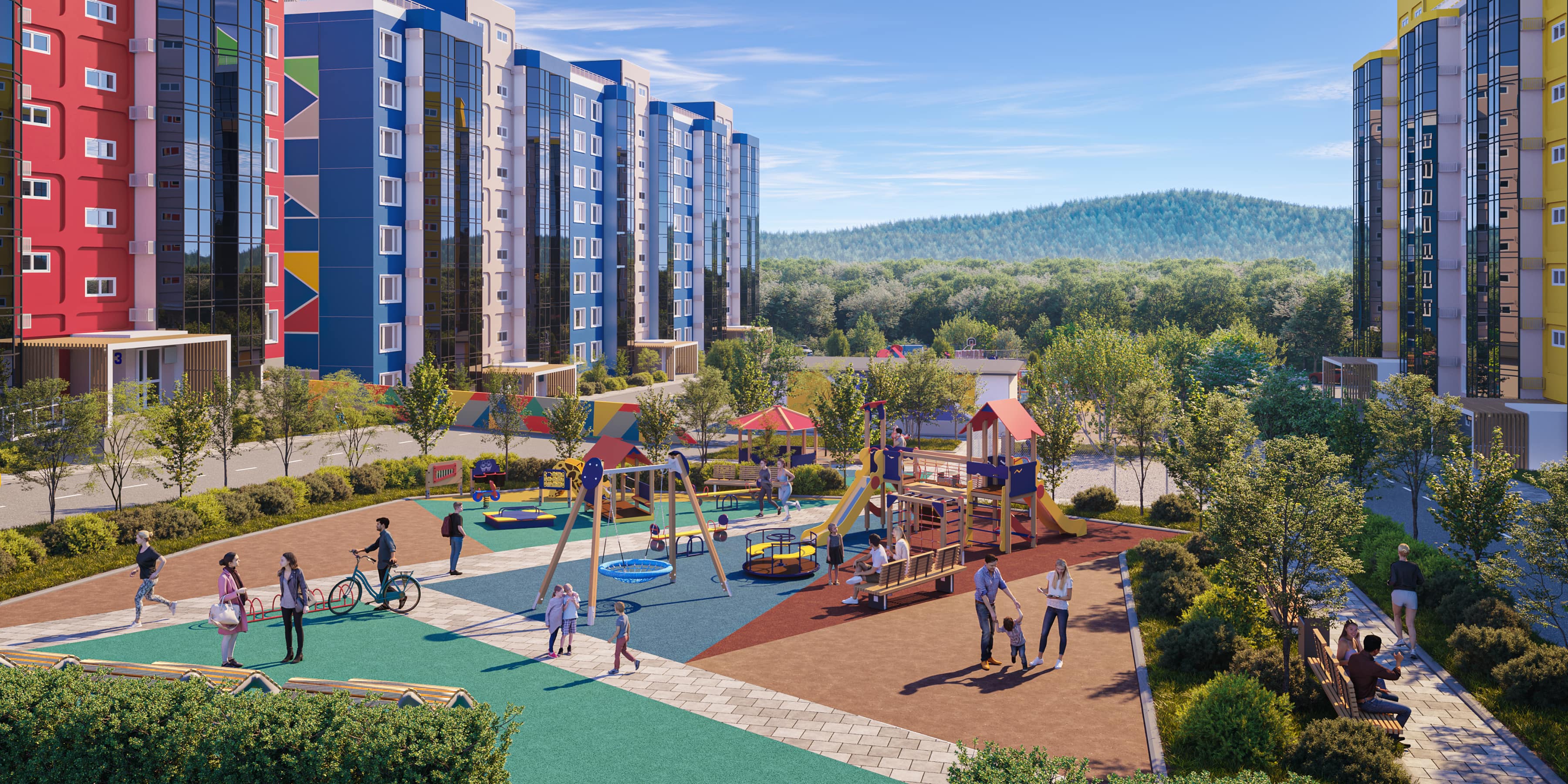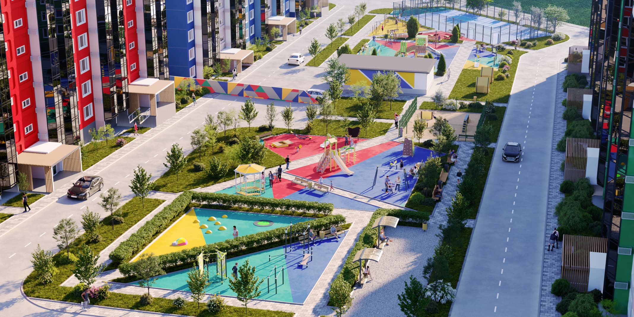 Калейдоскоп – баланс между функциональностью и эстетикой. Акцент планировки территории сделан на интересы разных поколений: детям – закрытые современные площадки для разных возрастов, взрослым – спортивные площадки и зоны отдыха.