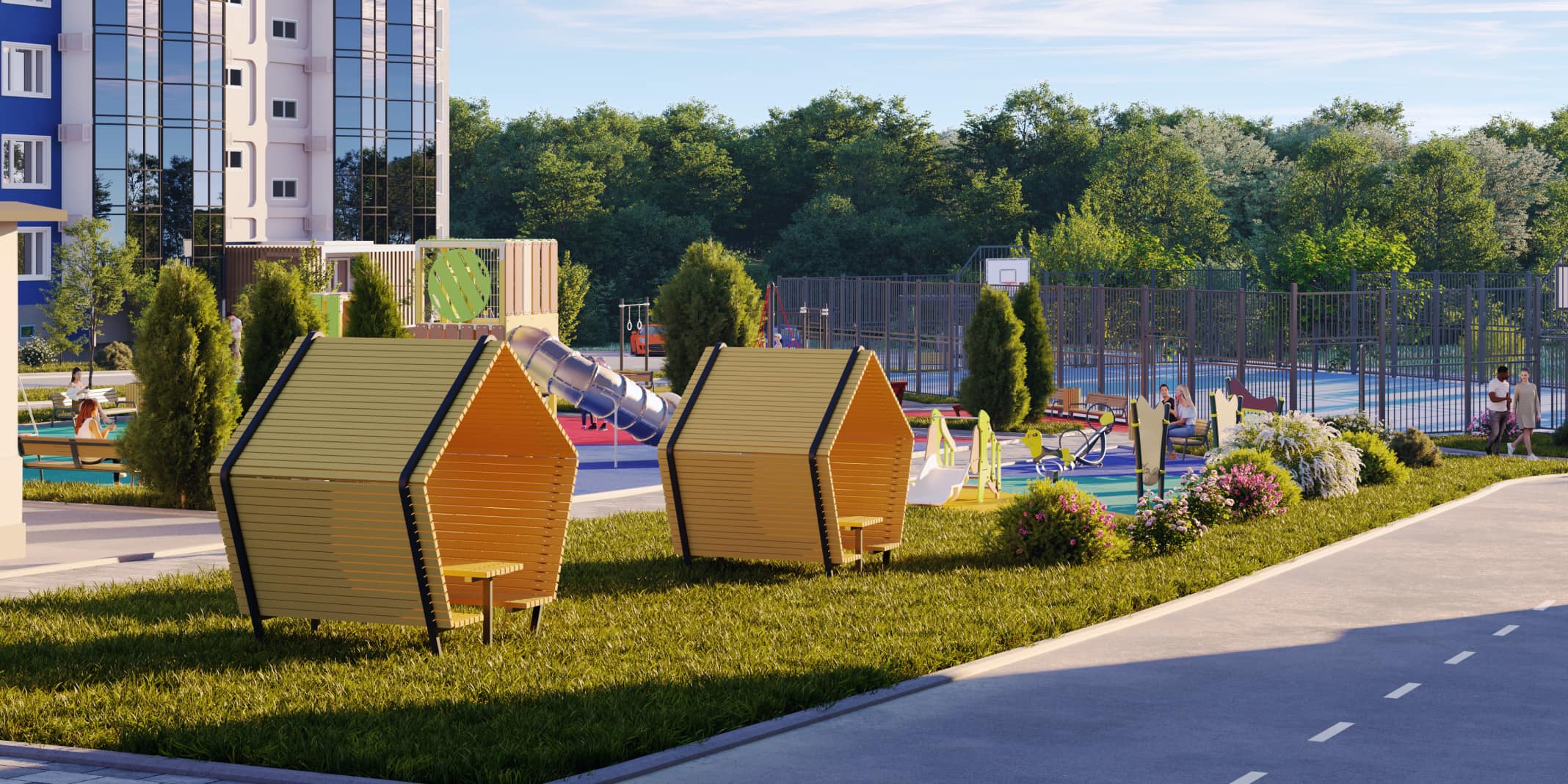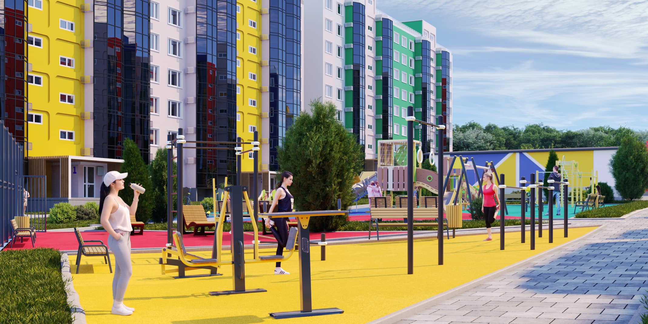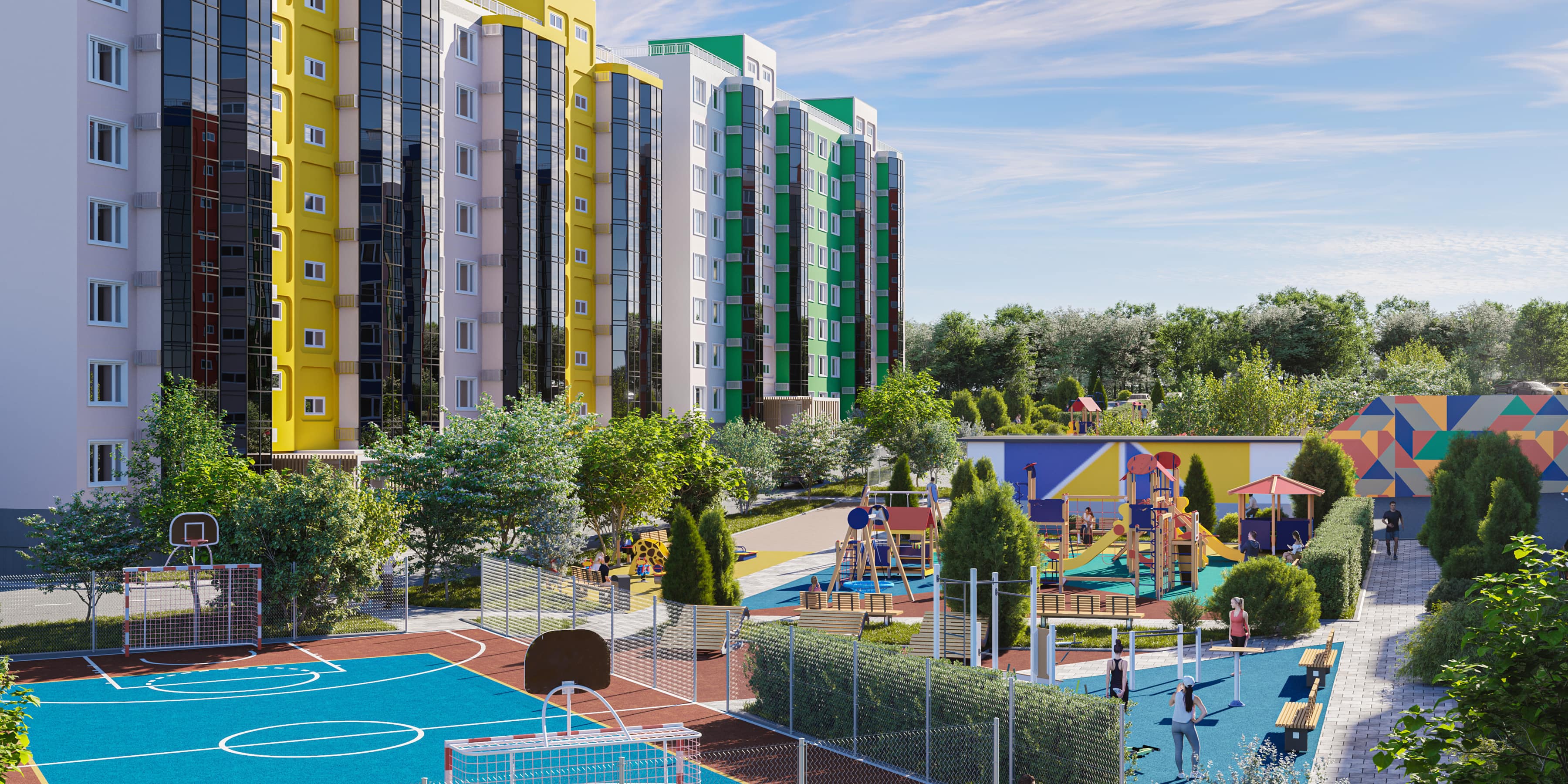 Калейдоскоп – баланс между функциональностью и эстетикой. Акцент планировки территории сделан на интересы разных поколений: детям – закрытые современные площадки для разных возрастов, взрослым – спортивные площадки и зоны отдыха.